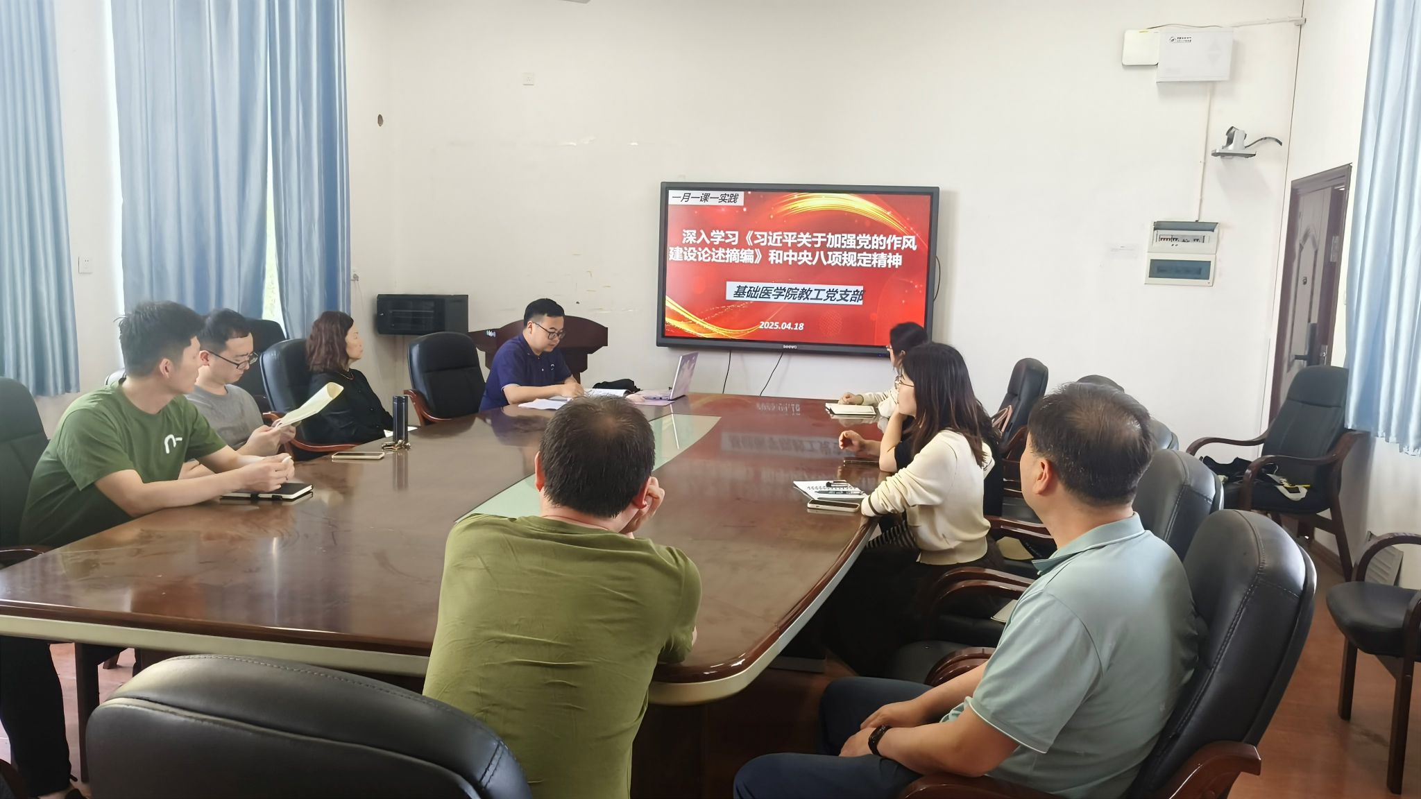 为深入贯彻中央八项规定精神,让全体党员深刻理解和把握中央八项规定精神的实质和内涵,切实增强遵守党的纪律和规矩的自觉性,加强党风廉政建设,提升党员的思想认识和纪律意识。2025年4月18日,医学部基础医学院教工党支部在仁雅楼组织开展“习近平关于加强党的作风建设论述摘编”及“中央八项规定精神”专题学习会,支委郭晓伟主持学习会。