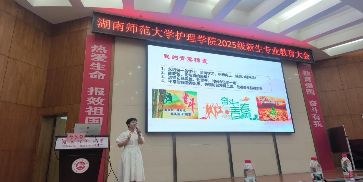 首先,由优秀校友代表——湖南师大附属第一人民医院急诊三部ICU护士长、全国优秀共产党员、全国三八红旗手、二十大党代表、2003级护理学专业校友徐芙蓉老师,为25级新生作经验分享。她结合自身经历,生动阐述了护理职业的崇高价值与使命担当,增强了同学们对专业的认同感和自豪感。