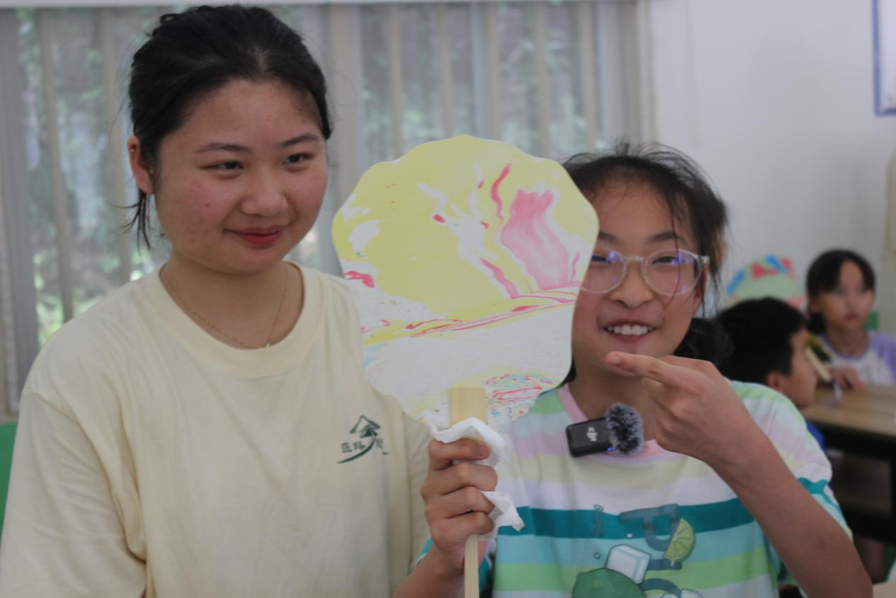 第二环节由支教组周真宇、郭可纯组织开展漆扇制作技艺传承课程。授课团队首先讲解漆扇的历史渊源与文化价值,随后指导学员进行实践操作。孩子们亲自动手制作漆扇,在实践中感受中国传统文化的魅力。这次课程既注重孩子们的全面发展,又有效地传承了宝贵的非遗文化。