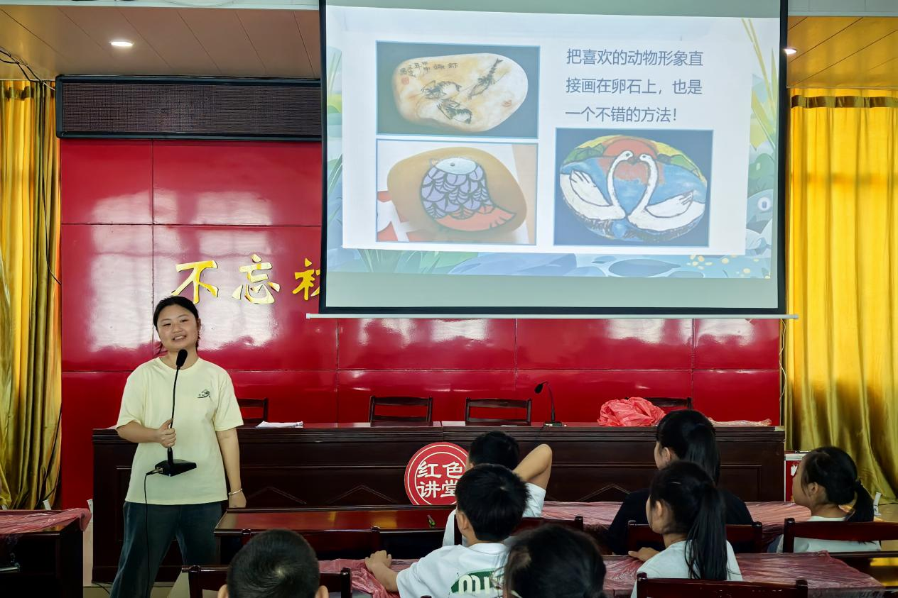 艺术实践课程由支教组成员郭可纯指导。课程通过多媒体展示石头画创作流程及优秀作品范例,随后组织学生进行实践创作。在实践团成员的帮助下,学生们充分发挥想象力,运用颜料在石头上进行艺术创作,展现了良好的动手能力和创新思维。